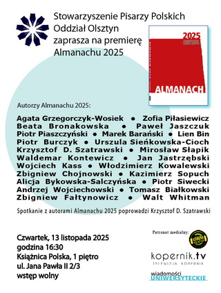 Stowarzyszenie Pisarzy Polskich Oddział Olsztyn zaprasza na premierę Almanachu 2025. Spotkanie z autorami Almanachu 2025 poprowadzi Krzysztof D. Szatrawski.
