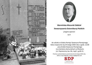 Warmińsko-Mazurski Oddział Stowarzyszenia Dziennikarzy Polskich zaprasza do udziału w Szlaku Pamięci Seweryna Pieniężnego, który odbędzie się 24 lutego 2026 roku o godzinie 12.00 przy Grobie Seweryna Pieniężnego na cmentarzu komunalnym w Olsztynie.