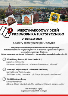 Międzynarodowy Dzień Przewodnika Turystycznego co roku przypomina, że za każdym murem i za każdym zaułkiem kryją się historie, które ktoś potrafi opowiedzieć z pasją. W Olsztynie tę pasję od lat pielęgnuje Koło Przewodników Turystycznych PTTK. W sobotę 21 lutego 2026 roku przewodnicy zapraszają mieszkańców i gości na trzy bezpłatne, dwugodzinne spacery tematyczne. Bez zapisów, bez formalności, za to z otwartą głową i wygodnymi butami.