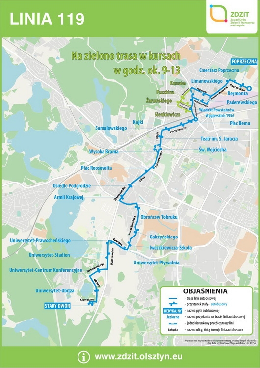 ZDZiT informuje, że od dzisiaj (1.03) w godzinach około 9.00-13.00 linia autobusowa nr 119 będzie kursować nową trasą ulicami: POPRZECZNA – Cicha – Zientary-Malewskiej – Paderewskiego – Limanowskiego – Jagiellońska – Żeromskiego – Limanowskiego – Pl. Bema – … – STARY DWÓR. W przeciwnym kierunku: STARY DWÓR – … – Pl. Bema – Limanowskiego – Niedziałkowskiego – Jagiellońska – Reymonta – Zientary-Malewskiej – POPRZECZNA.