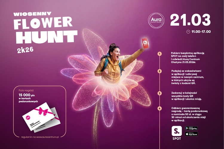 Wiosenny Flower Hunt to sprawdzona formuła zabawy z nagrodami. Akcja odbywa się z wykorzystaniem bezpłatnej aplikacji SPOT. Aby wygrać, trzeba podążać za wskazówkami w aplikacji i odkrywać miejsca w centrum, w których ukryte są kwiaty z kodami QR. Następnie należy zeskanować w kolejności wszystkie kody QR w aplikacji i ukończyć misję. W ciągu 30 minut od ukończenia misji w aplikacji SPOT należy odebrać nagrodę w postaci karty podarunkowej o nominale 50 zł!