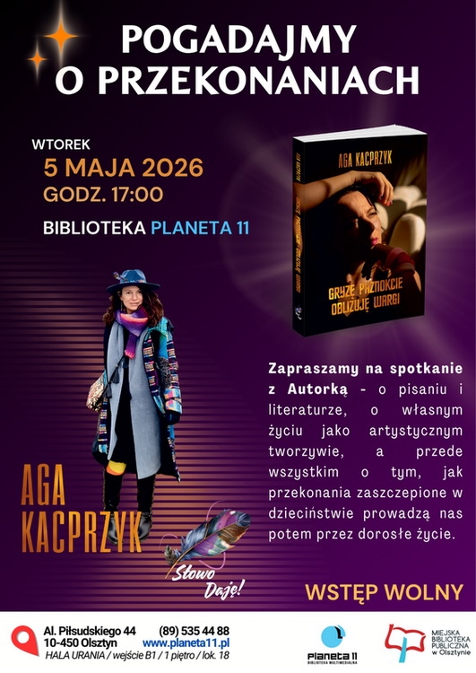 Biblioteka Multimedialna Planeta 11, filia Miejskiej Biblioteki Publicznej w Olsztynie, zaprasza we wtorek (5.05), o godzinie 17.00, na spotkanie autorskie z Agnieszką Kacprzyk – pisarką, dziennikarką, twórczynią niezwykle popularnego profilu „Słowo daję”, który inspiruje tysiące kobiet.